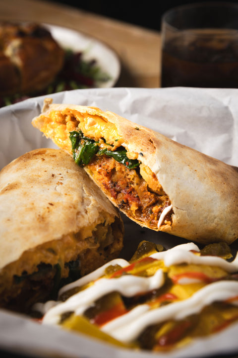 - Roasted sweet potato, black beans, rich tomato sauce, fresh spinach, lime & coriander rice all wrapped up and topped with spicy jalapeño mayo. Served with a side of tortilla chips.