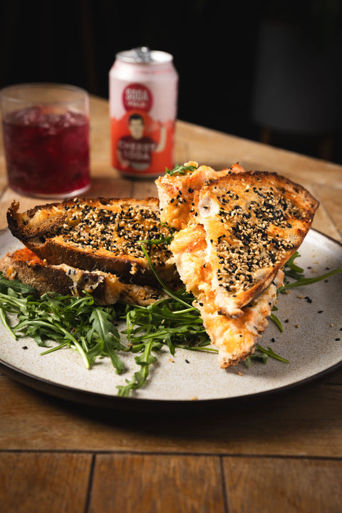 - Tangy kimchi is layered with a blend of sharp cheddar and melty mozzarella on toasted sourdough. For an extra kick, it is finished with a sprinkle of toasted sesame seeds and a drizzle of sriracha and served on a bed of rockets.