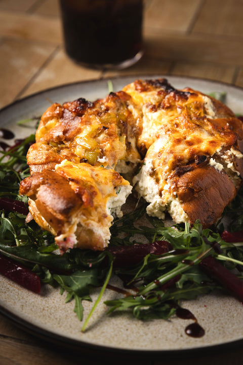 - A toasted bagel stuffed with garlic and herb butter, layered with chive cream cheese, topped with smoky bacon, crispy onions, melted cheddar cheese, and Mediterranean peppers, served on a bed of rocket, pickled beetroot, and balsamic glaze.