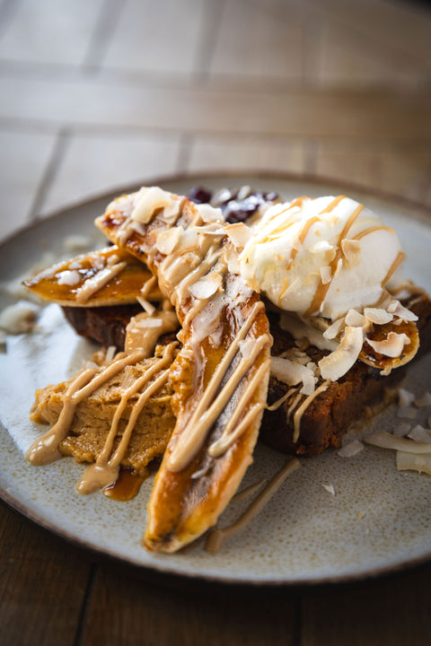 - A vegan-friendly loaf packed with ripe bananas and rich dark chocolate with a hint of cinnamon. Served warm with our house-made espresso butter, caramelised banana, peanut butter drizzle and toasted coconut flakes, all topped with a berry compote & homemade vegan vanilla coconut ice cream.